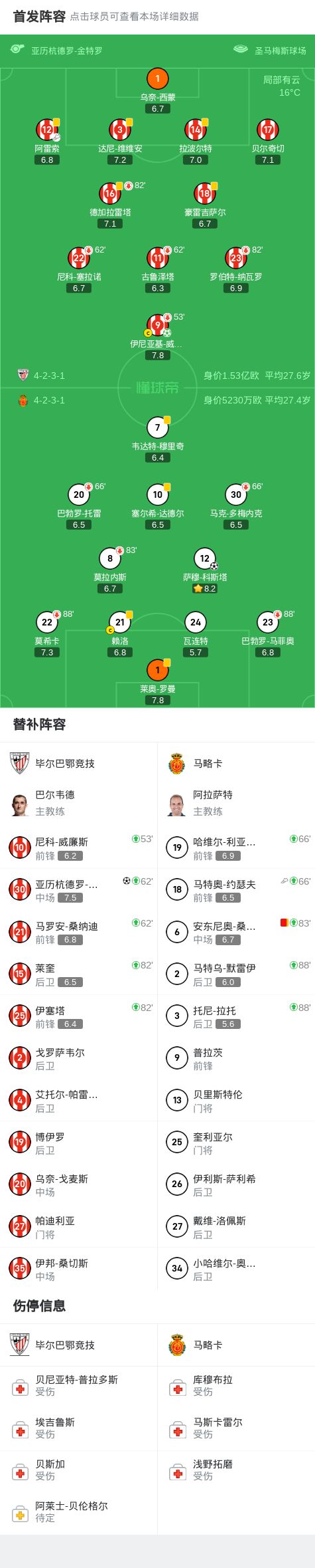 北京时间10月5日西班牙足球甲级联赛 联赛 第8轮,毕尔巴鄂竞技主场对阵马略卡。毕尔巴鄂竞技伊尼亚基-威廉斯破门,亚历杭德罗-雷戈破门。马略卡萨穆-科斯塔破门。最终比分毕尔巴鄂竞技 2-1 马略卡。