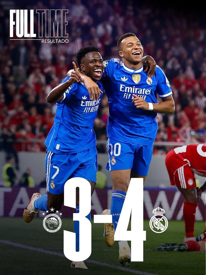比赛结束,皇家马德里在客场击败奥林匹亚科斯!